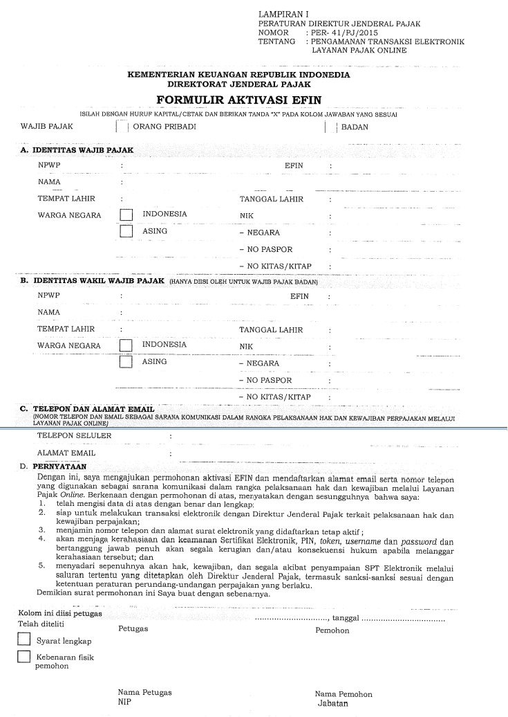 (hanya diisi oleh wajib pajak badan atau bendahara) contoh pengisian formulir aktivasi efin badan. Mengisi formulir permohonan aktivasi efin yang sudah ditandatangani dan .